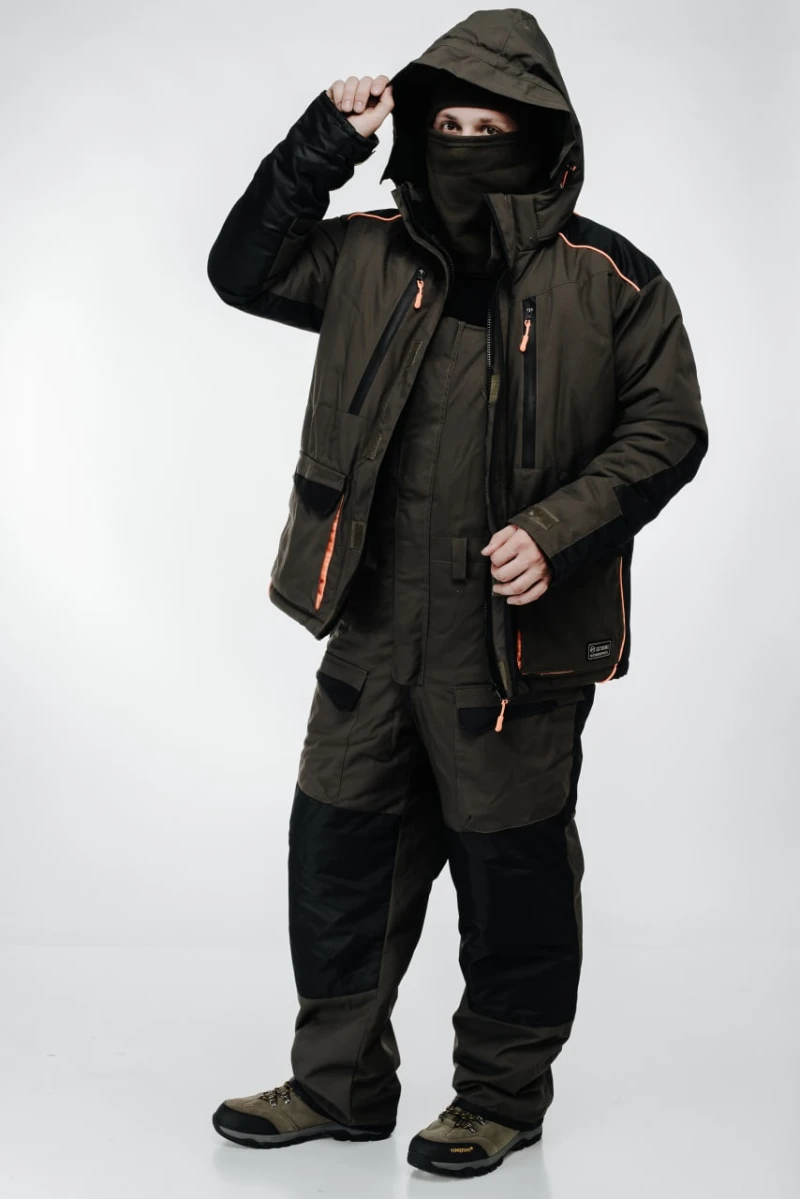 Костюм складається з напівкомбінезону та куртки. Продуманий до дрібниць. Утеплений каптур. Високотехнологічна мембрана забезпечує відмінну терморегуляцію. Якісна захисна змійка. Фіксація кишень на липучці. Верхній шар тканини – водовідштовхувальний таслан. Енергозберігаючий утеплювач – тинсулейт. Морозостійкий матеріал. Багатошарова мембранна тканина.