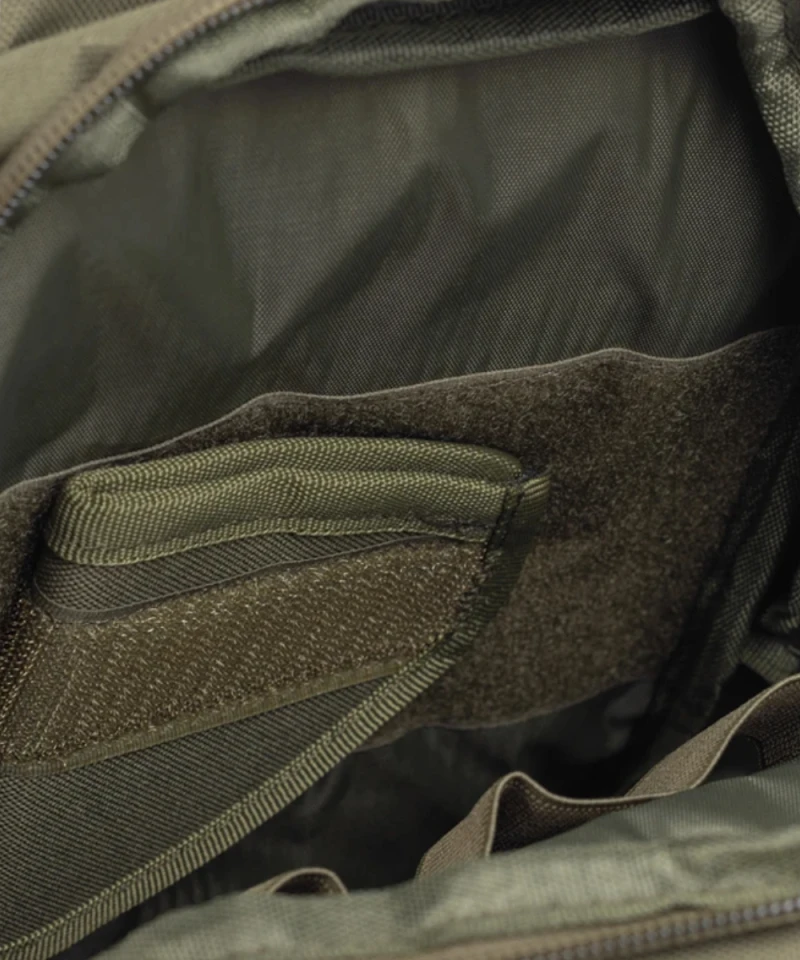 - Основне відділення застібається на блискавку. Усередині: кріплення для зброї (яке можна відкріпити), додатковий "запобіжник" для миттєвого відкриття рюкзака, та кріплення з еластичної гумки для різних дрібниць;