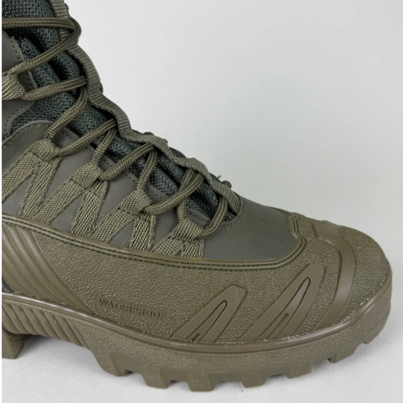 - Технология WATERPROOF: для лучшей защиты от промоканий, в нижней части берцы усилены резиновой износостойкой накладкой ПВХ. Она не дубеет и не трескается даже в сильные морозы. Так же все швы изнутри проклеены термолентой для дополнительной защиты от влаги.