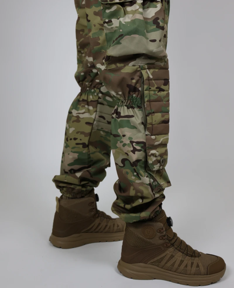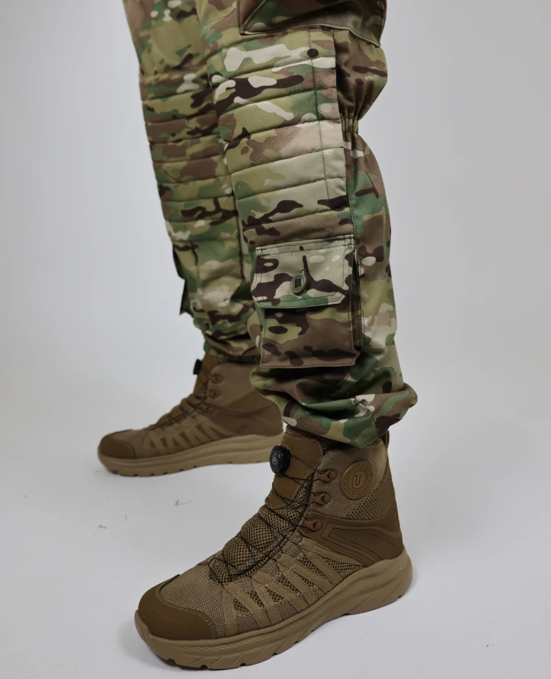 - На коленях предусмотрены специальные вставки из более плотного материала. Это решение защищает суставы при активных действиях на неровной поверхности, при стрельбе из положения сидя или лежа.