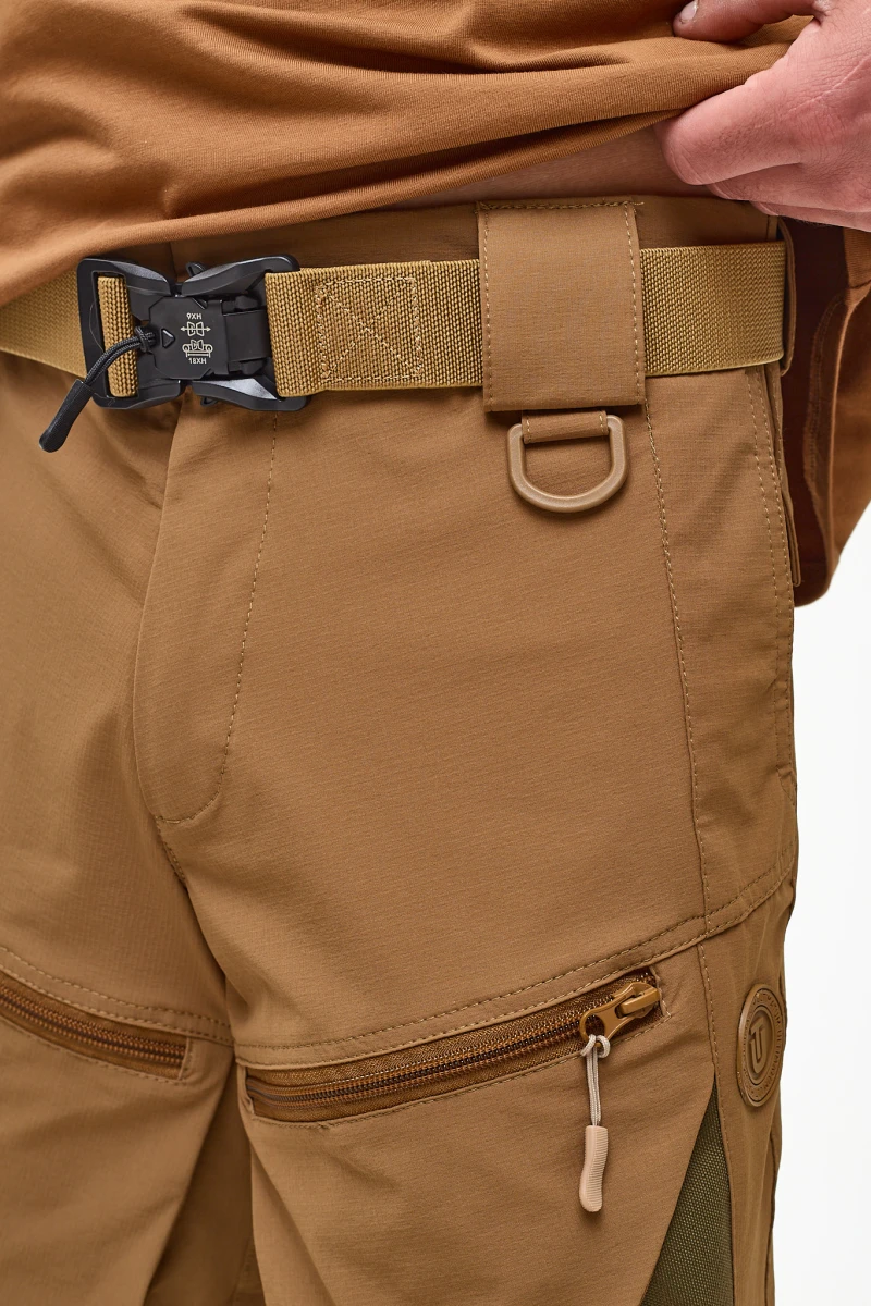 Виготовлені з тканини Rip-stop Double Line, яка відрізняється подвійним переплетенням ниток з секціями розміром 0,2 на 0,2 см, що значно підвищує її стійкість до розривів та механічних пошкоджень. Завдяки щільності 155 г/м² шорти мають оптимальний баланс легкості та зносостійкості, забезпечуючи зручність навіть у спеку.