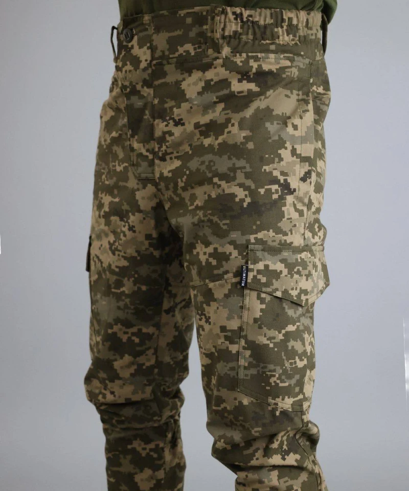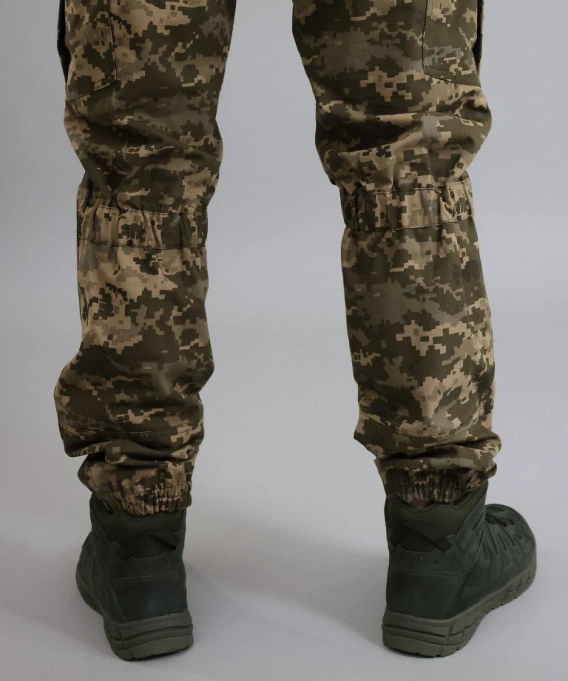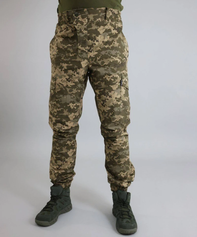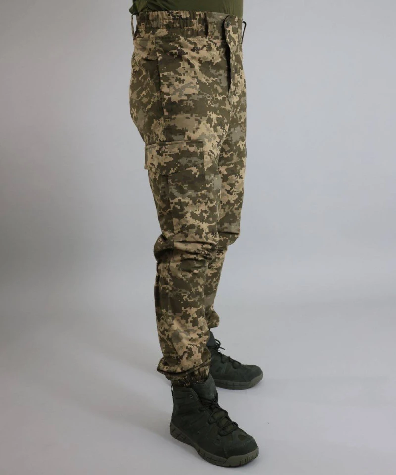 Тканина довго не замазується і швидко сохне. Для зручності модель доповнена бічними та накладними кишенями, гумкою під колінами та по низу виробу, що регулюється поясом.