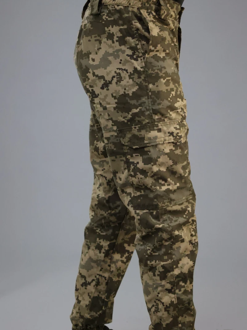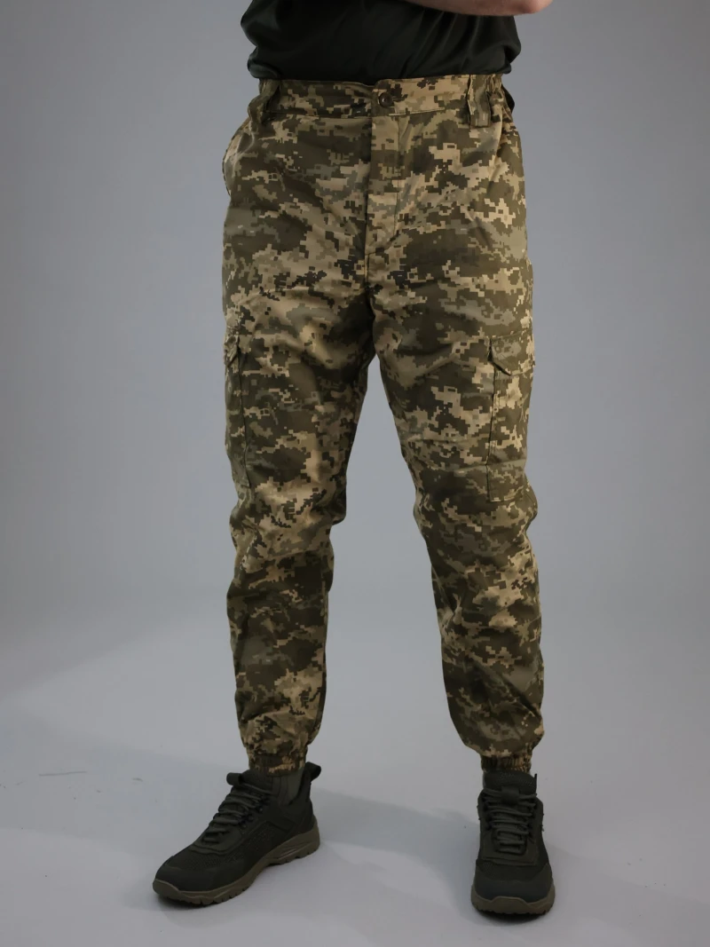 Пояс брюк та штанини на резинці. Чотири кишені. Зручна посадка, не стискує рухів. Тканина має високу міцність, тому штани дуже практичні.