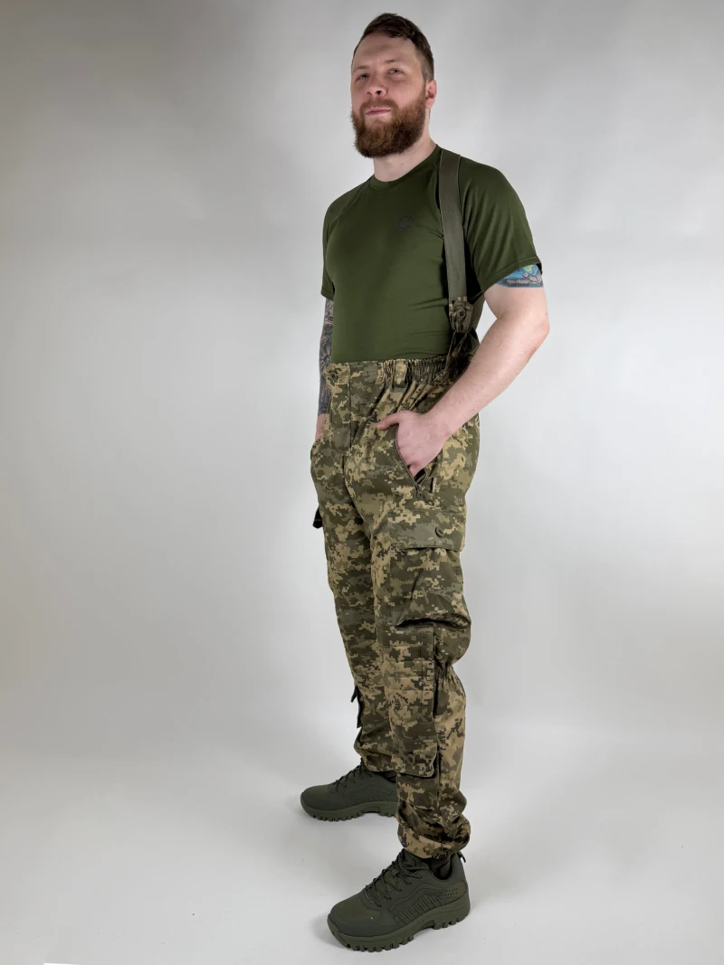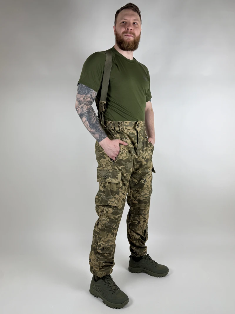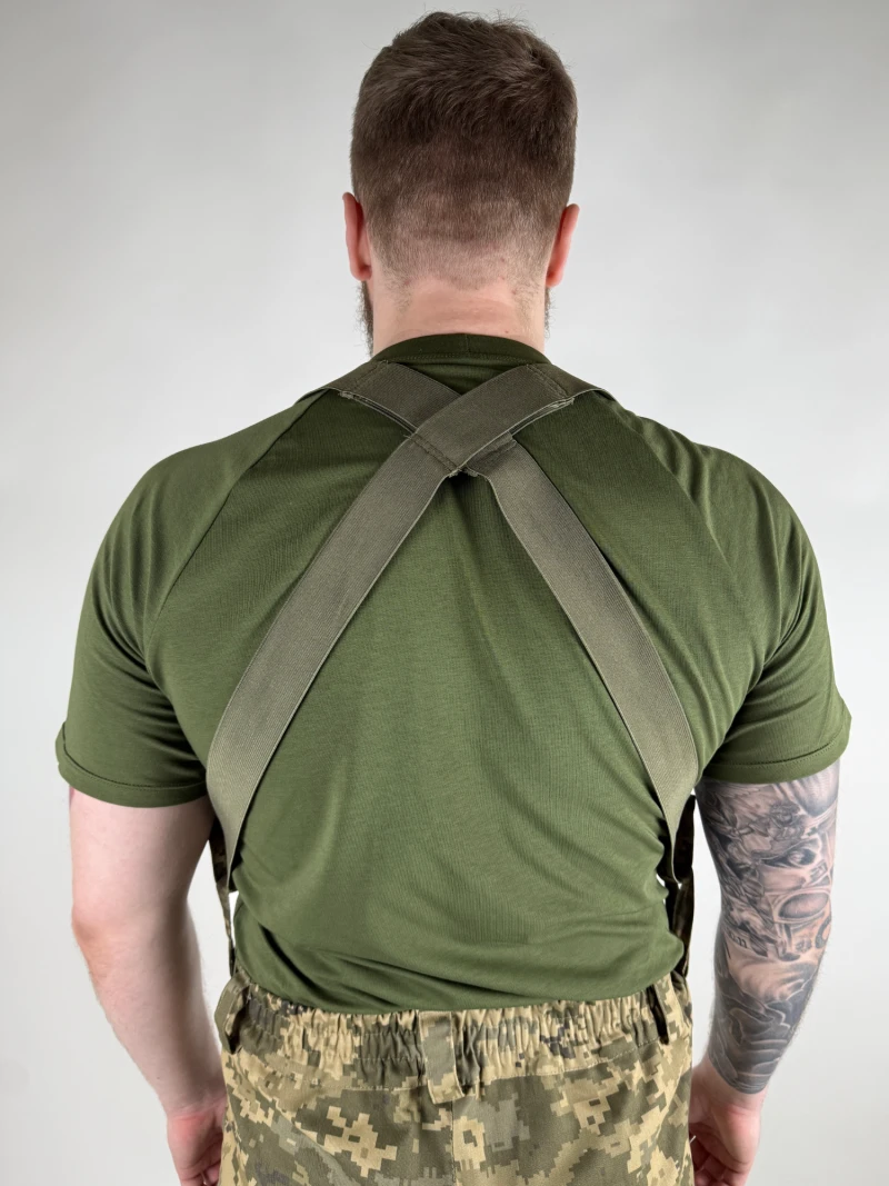 У комплекті — еластичні підтяжки, які рівномірно розподіляють навантаження та дозволяють носити штани без ременя, що особливо зручно при використанні розвантажувального жилета або пояса.